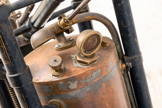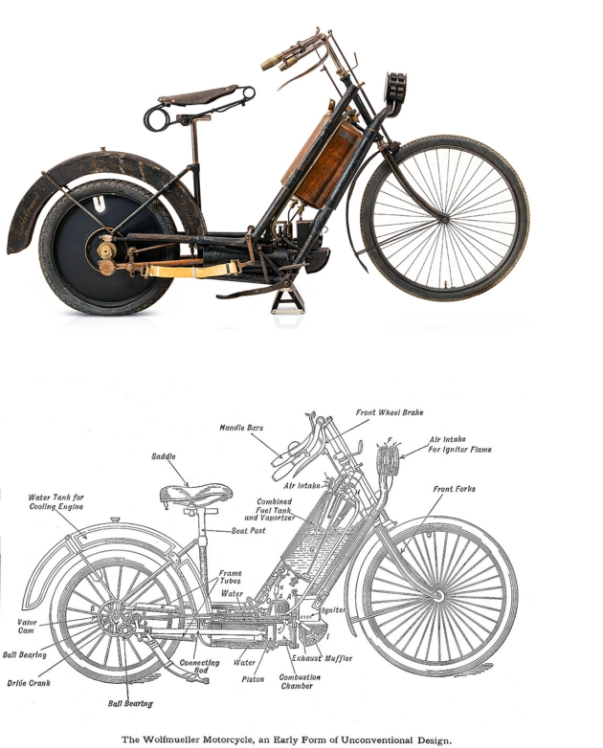 Конструкція цього мотоцикла дуже цікава. Його бензиновий мотор не мав карбюратора, який на той час ще розробляли. Тому змішування палива з повітрям відбувалося просто в бензобаку, при його струшуванні під час їзди. Далі отримана робоча суміш надходила спеціальною трубкою безпосередньо в циліндри. До речі, бак для системи водяного охолодження було виготовлено у формі заднього крила.