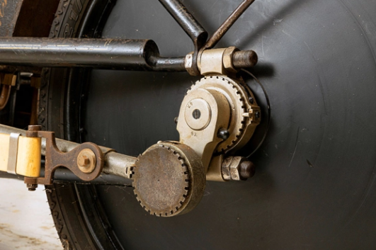 У трансмісії були відсутні і зчеплення, і коробка передач. Зусилля від поршнів передавалося за допомогою тяг-шатунів безпосередньо на заднє колесо, яке й виконувало роль маховика. Гумові еластичні стрічки служили для повернення шатунів у вихідне становище. Подібна схема, зрозуміло, можлива була тільки за досить тихохідного двигуна. А він і був таким: максимальна кількість обертів не перевищувала 240 за хвилину.