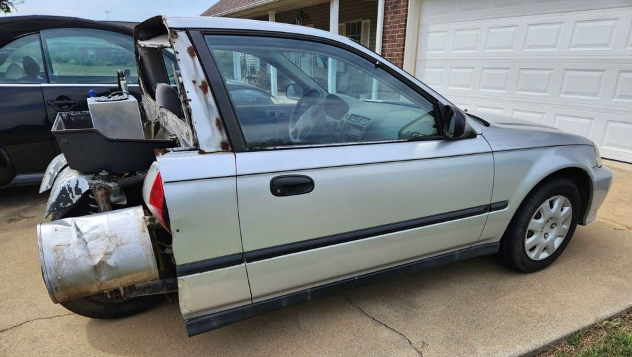 Уході “експериментів” власник залишив від Honda Civic 2000 року випуску передню частину кузова з двома провідними колесами. Задньої частини кузова тепер уже немає, як і багажника, а два інших колеса розташовані впритул один до одного. Ненадійна конструкція утримується на саморобній підвісці, що кріпиться на залишках кузова седана.