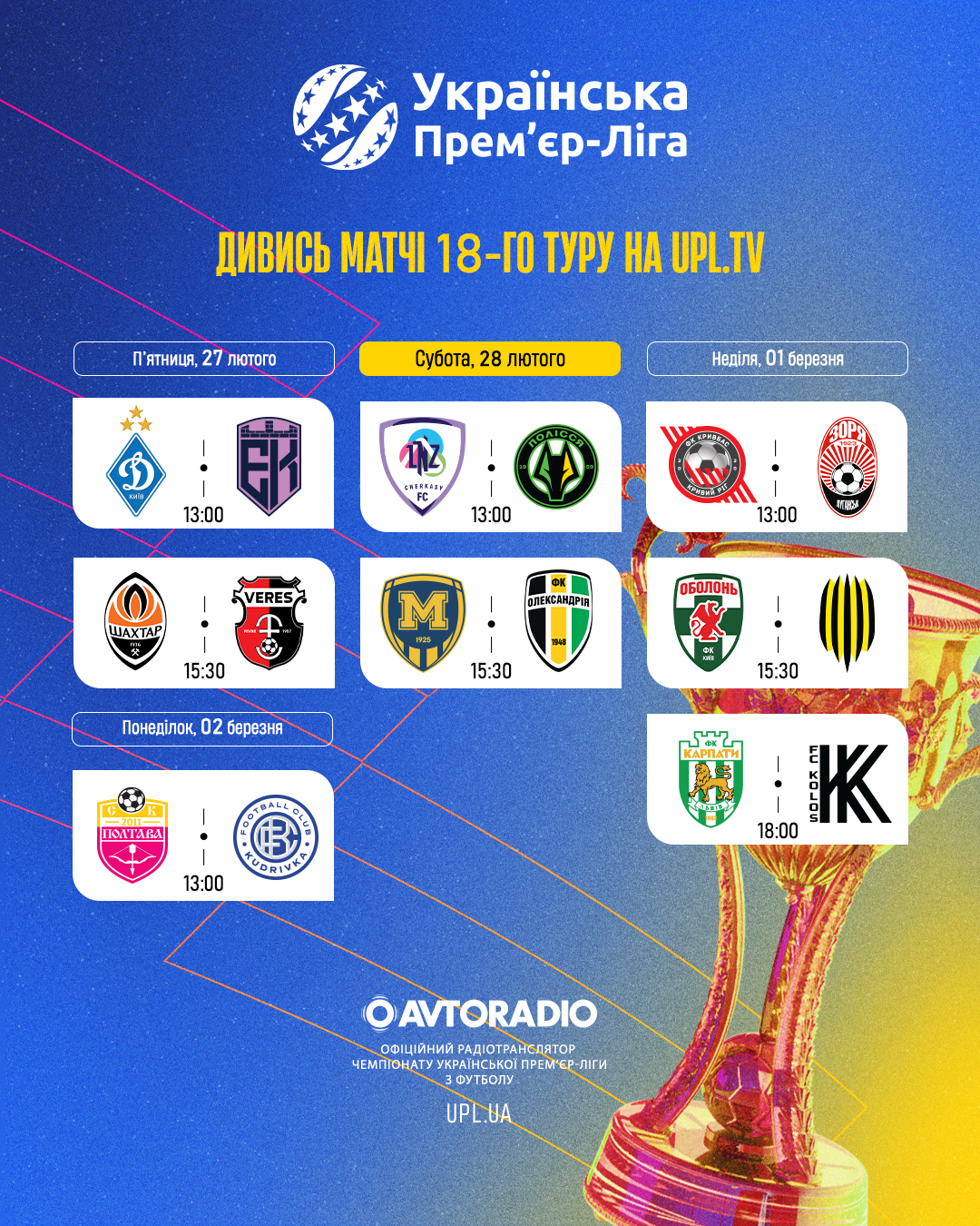 Всім привіт! Минулого тижня після зимових канікул повернулася наша рідна Українська Прем’єр-Ліга. Сьогодні згадаємо події попереднього ігрового тижня та поглянемо у перспективу прийдешнього вікенду. У вісімнадцятому турі на нас очікує битва за «шість очок» між «Оболонню» та «Рухом», протистояння «Кривбасу» та «Зорі», дуель «Карпат» проти «Колосу», а також центральний матч туру «ЛНЗ» – «Полісся», трансляцію якого можна буде слухати, на хвилях, сайтах та додатках «Авторадіо» та «Радіо П’ятниця». А всі матчі ігрового тижня можна буде традинційно переглянути на UPL TV.
