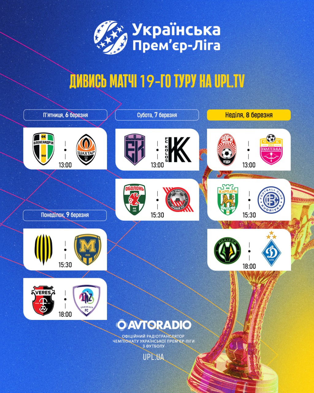 Всім вітання! У midweek відбулися три матчі 1/4 Кубка України за участі трьох команд вищого дивізіону, а тепер вриваємося у черговий ігровий тиждень Української Прем’єр-Ліги. У дев’ятнадцятому турі на нас очікує протистояння «Оболоні» та «Кривбаса», двобій «Олександрії» та «Шахтаря», битва за «шість очок» між «Карпатами» та «Кудрівкою», а також центральний матч вікенду між «Поліссям» та «Динамо», трансляцію якого можна буде слухати, на хвилях, сайтах та додатках «Авторадіо» та «Радіо П’ятниця». А всі матчі туру можна буде традиційно переглянути на UPL TV.