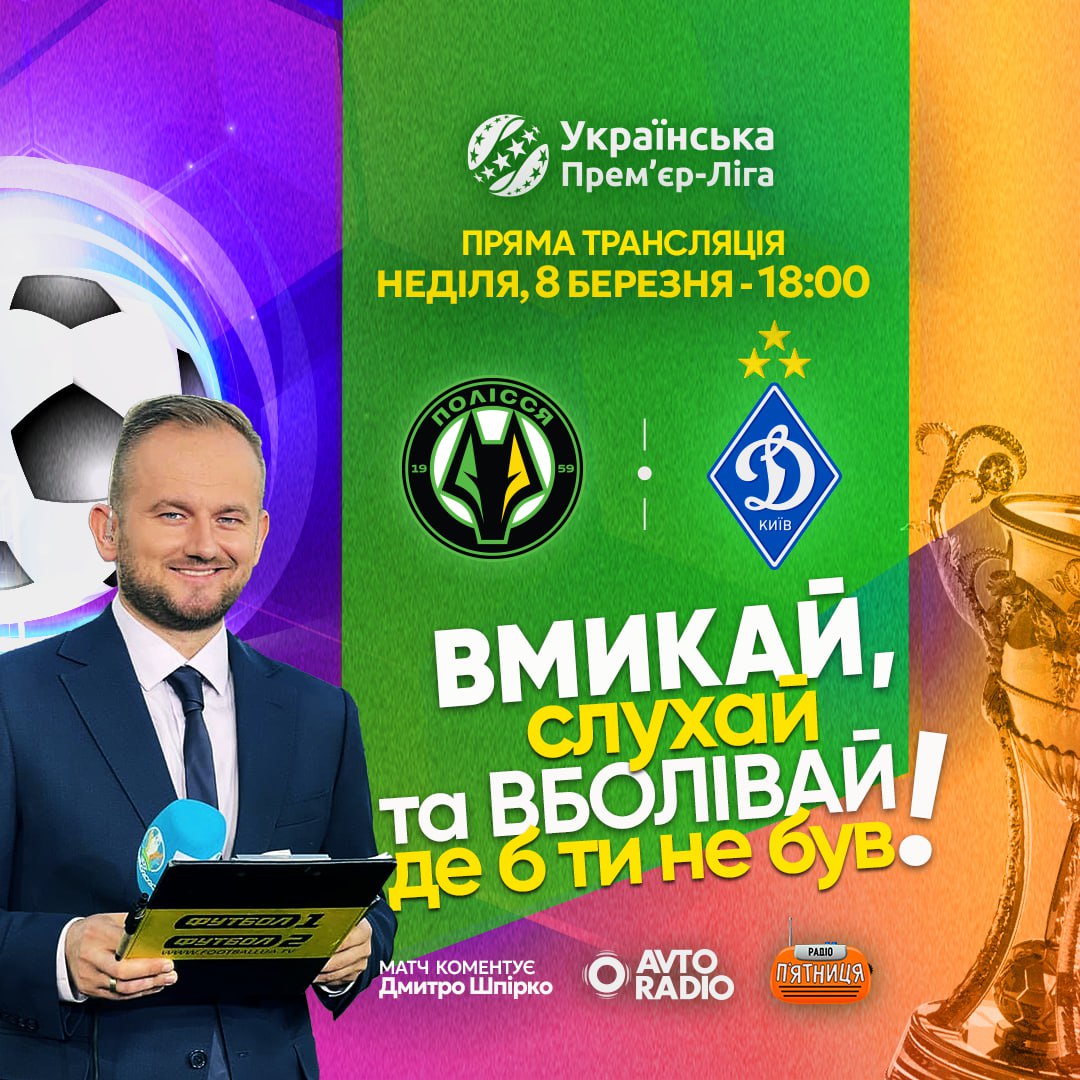 Радіотрансляцію матчу між житомирським «Поліссям» та київським «Динамо» із коментарем Дмитра Шпірка можна буде почути на «Авторадіо» та «Радіо П’ятниця», отже налаштовуйте свої приймачі правильно у неділю о 18:00.