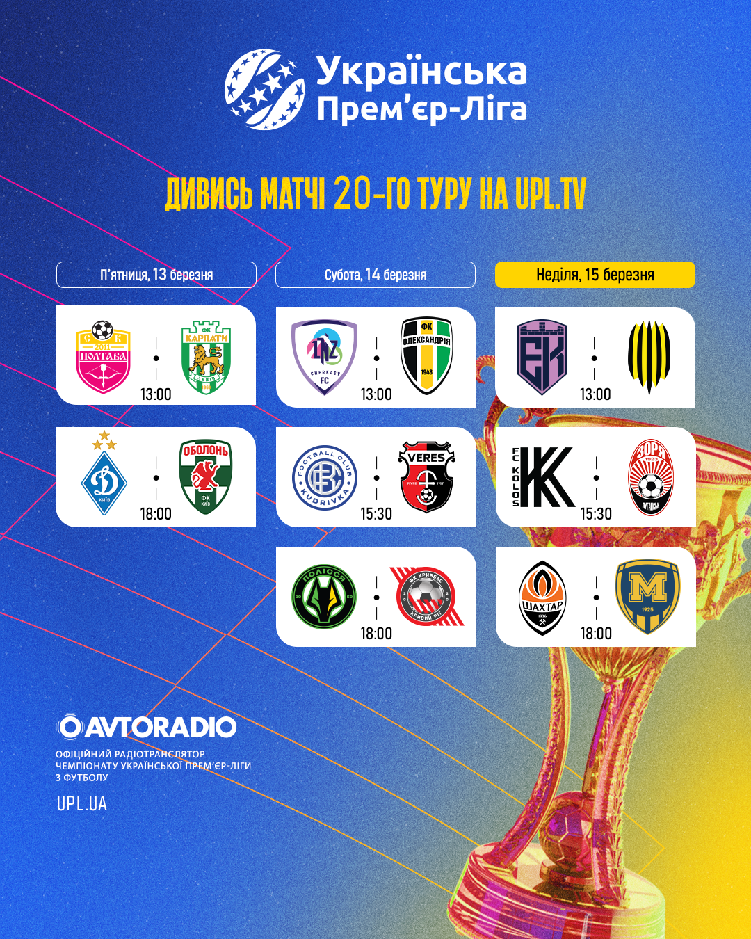 Всім привіт! Після єврокубкового футболу підбираємося до фінальної треті рідної Української Прем’єр-Ліги. У двадцятому турі на нас очікує столичне дербі між «Динамо» та «Оболонню», та одразу три матчі, що претендують на звання центрального: поєдинок «Полісся» Руслана Ротаня проти «Кривбаса» Патріка Ван Леувена , битва за «шість очок» між «Колосом» та «Зорею», а також дуель «Шахтаря» та «Металіста 1925», трансляцію якого можна буде слухати, на хвилях, сайтах та додатках «Авторадіо» та «Радіо П’ятниця». А всі матчі ігрового тижня можна традиційно переглянути на UPL TV.