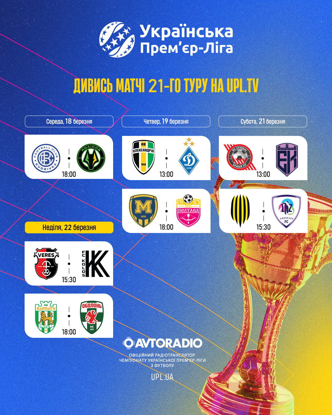 Всім вітання! Незвично рано розпочинаємо ігровий тиждень Української Прем’єр-Ліги, а все для того щоб збірна України краще підготувалася до вирішальних матчів за путівку на Чемпіонат світу 2026 у США, Мексиці та Канаді. Вриваємося в останню третину чемпіонату, де у двадцять першому турі на нас очікує дуель «Олександрії» та «Динамо», протистояння «Епіцентра» та «Кривбаса», зустріч головного тренера «ЛНЗ» Віталія Пономарьова зі своєю колишньою командою «Рухом» та матч за «шість» очок між «Карпатами» та «Оболонню», трансляцію якого можна буде слухати, на хвилях, сайтах та додатках «Авторадіо» та «Радіо П’ятниця». А всі матчі ігрового тижня традиційно запрошуємо переглянути на UPL TV.
