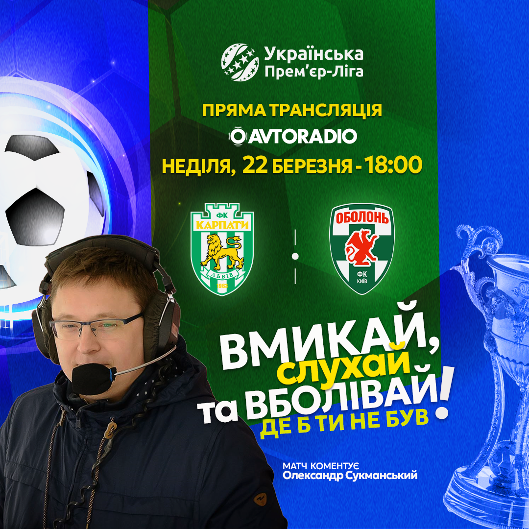 Радіотрансляцію матчу між львівськими «Карпатами» та київською «Оболонню» із коментарем Олександра Сукманського можна буде почути на «Авторадіо» та «Радіо П’ятниця», тож налаштовуйте свої приймачі правильно у неділю о 18:00.
