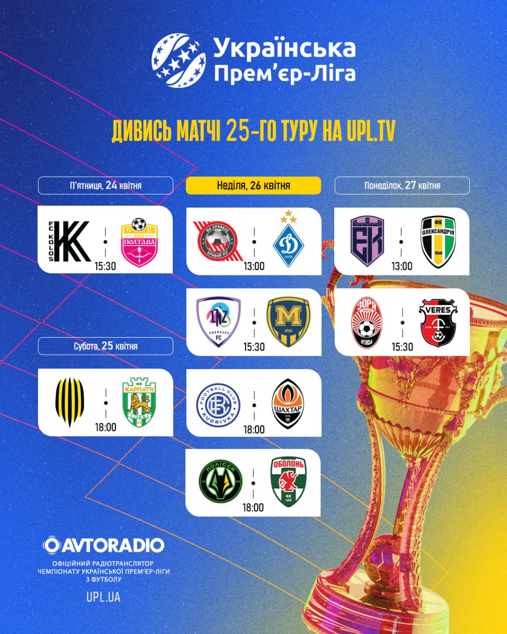 Всім привіт! Після півфінальних матчів Кубка України в яких свої перемоги здобули «Динамо» та «Чернігів» над «Буковиною» та «Металістом 1925» відповідно, перемикаємо свою увагу на Українську Прем’єр-Лігу. У двадцять п’ятому ігровому тижні на нас очікує львівське дербі між «Рухом» та «Карпатами», безкомпромісна боротьба «Кривбасу» та «Динамо», протистояння «ЛНЗ» та «Металіста 1925», а також поєдинок «Кудрівки» проти виснаженого насиченим графіком «Шахтаря», трансляцію якого можна буде слухати на хвилях, сайтах та додатках «Авторадіо», та «Радіо П’ятниця». Ну а всі матчі ігрового тижня можна традиційно дивитися на UPL TV.