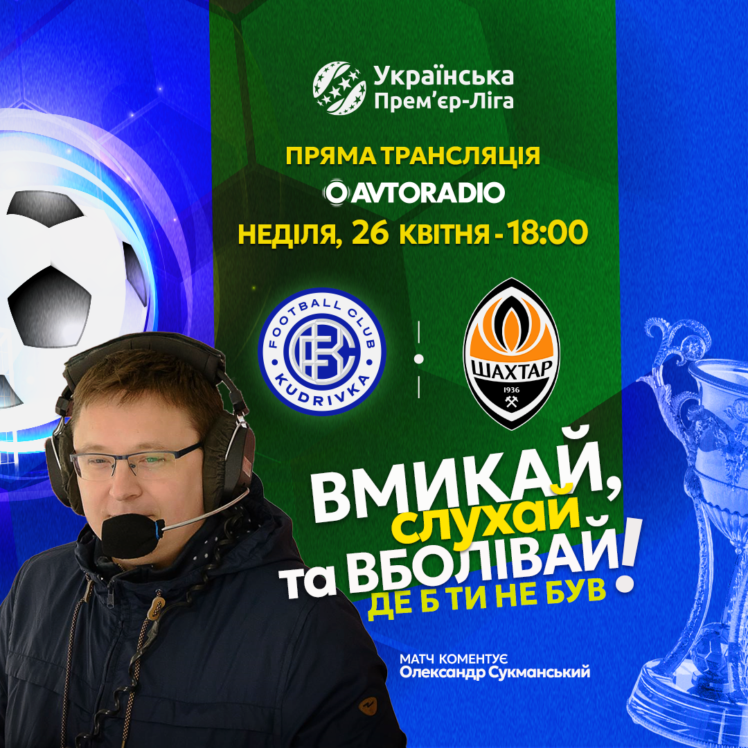 Радіотрансляцію матчу між «Кудрівкою» та донецьким «Шахтарем» із коментарем Олександра Сукманського можна буде почути на хвилях «Авторадіо» та «Радіо П’ятниця», отже налаштовуйте свої приймачі правильно у неділю о 18:00.