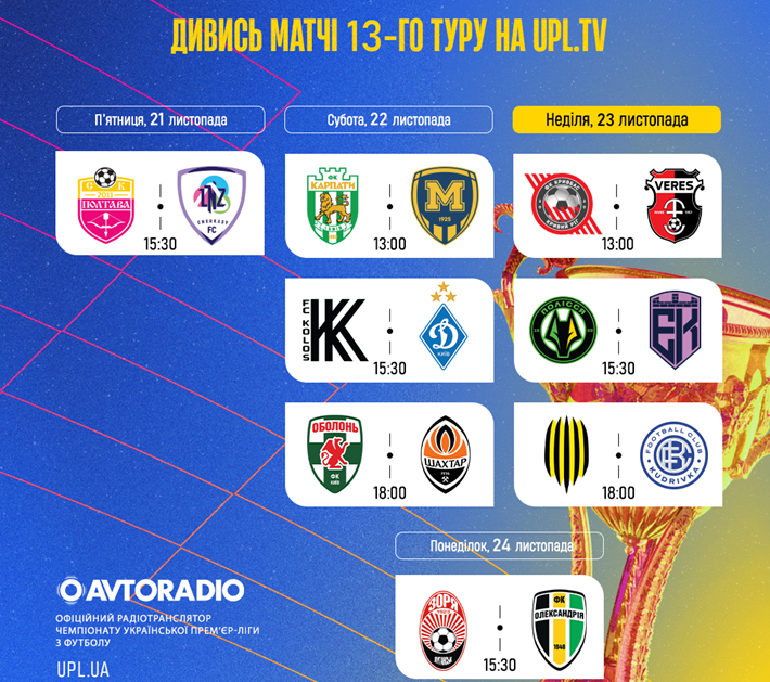 Коротко резюмували листопадові матчі збірних, а тепер переходимо безпосередньо до тринадцятого туру рідної Української Прем’єр-Ліги. В ньому на нас очікують безкомпромісна боротьба між «Колосом» та «Динамо», дуель «Карпат» з «Металістом 1925», візит «Шахтаря» до «Оболоні», а також матч «Руху» та «Кудрівки» трансляцію якого можна буде слухати на хвилях, на сайтах та у додатках «Авторадіо» та «Радіо П’ятниця». А всі матчі туру можна традиційно переглянути на UPL TV.