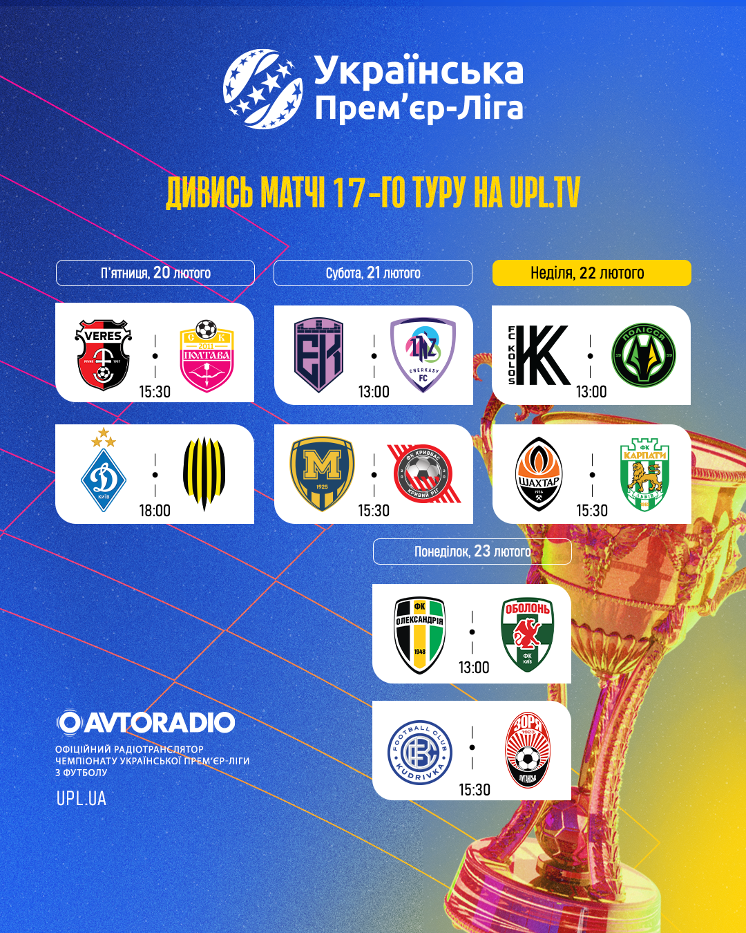 Після паузи у десять тижнів повертається Українська Прем’єр-Ліга. Сьогодні підсумуємо підготовку команд до весняної частини сезону, трансфери і звичайно вже звичний для нас анонс прийдешнього ігрового вікенду. В сімнадцятому турі на нас очікує запекла боротьба між «Олександрією» та «Оболонню», дуель «Металіста 1925» та «Кривбасу», поєдинок «Полісся» та «Колосу» та центральний матч туру «Шахтар» – «Карпати», трансляцію якого можна буде слухати на хвилях, на сайтах та у додатках «Авторадіо» та «Радіо П’ятниця». А всі матчі ігрового тижня можна буде традиційно переглянути на UPL TV.