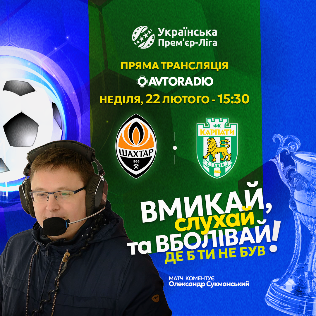 Радіотрансляцію матчу між донецьким «Шахтарем» та львівським «Карпатами» із коментарем Олександра Сукманського можна буде почути на «Авторадіо» та «Радіо П’ятниця», отже налаштовуйте свої приймачі правильно у неділю, о 15:30!