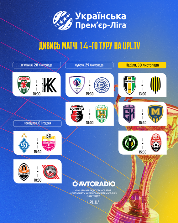 Пролетів midweek насичений єврокубками і ми вриваємося у черговий тур Української Прем’єр-Ліги. Пригадуємо матчі минулого туру, які подарували нам чимало голів і аналізуємо матчі чотирнадцятого туру, в якому на нас очікують протистояння бойовитих «Оболоні» та «Колосу», боротьба аутсайдерів чемпіонату «Олександрії» та «Руху», центральна гра туру «Шахтар» – «Кривбас», а також безкомпромісний матч між «Поліссям» та «Зорею» трансляцію якого можна буде слухати на хвилях, на сайтах та у додатках «Авторадіо» та «Радіо П’ятниця». Ну а всі матчі туру можна традиційно переглянути на UPL TV.