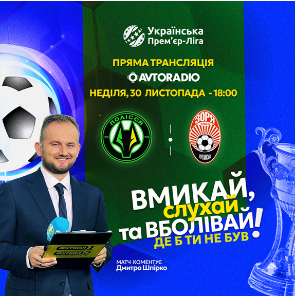 Радіотрансляцію матчу між житомирським «Поліссям» та луганською «Зорею» із коментарем Дмитра Шпірка можна буде почути на «Авторадіо» та «Радіо П’ятниця», отже налаштовуйте приймачі правильно у неділю, о 18:00!